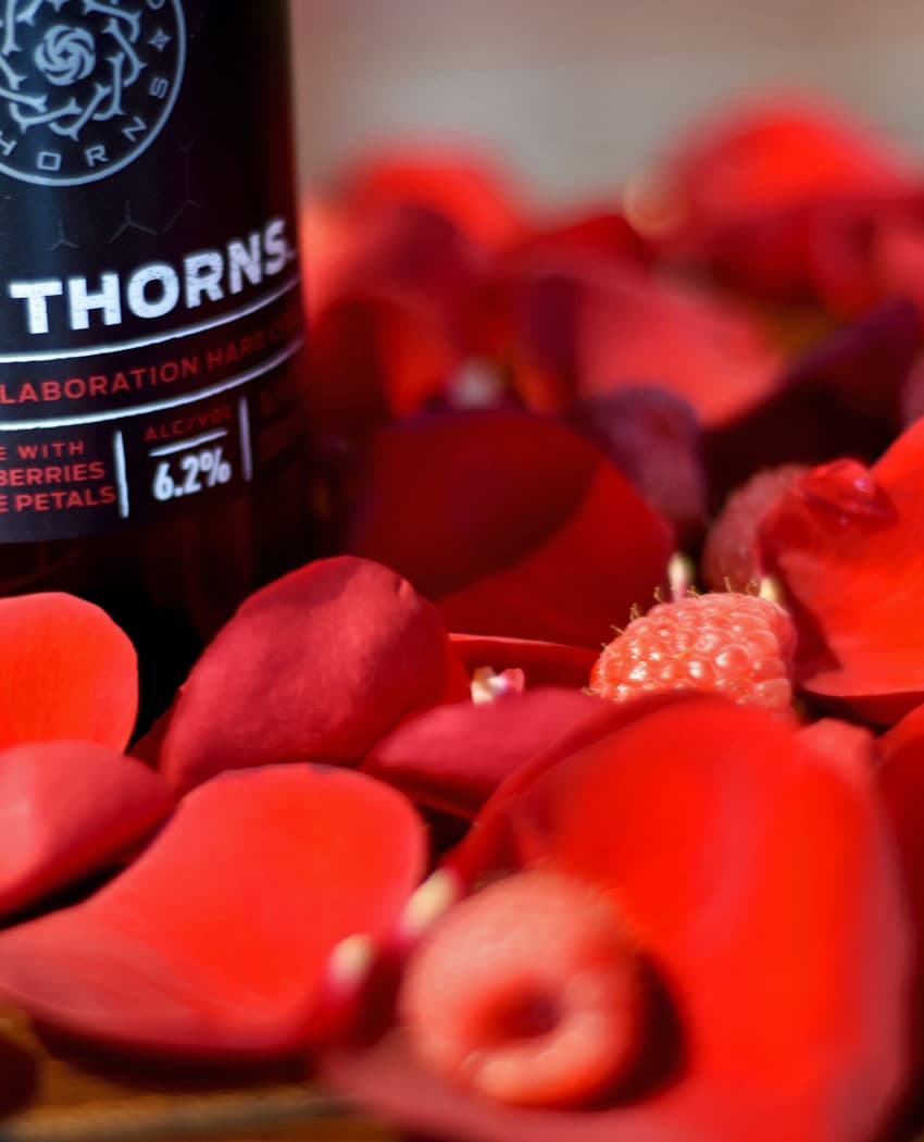 Two Thorns juggles Pacific Northwest raspberries and fragrant damask rose petals for a striking berry cider that is both elegant and lively. We add crushed raspberries directly to the fermentation tank, while the rose petals are added to the cider after fermentation has been completed and the the tank has been cold crashed. The result is a cider with raspberries shining through with tons of fresh cane fruit character, and the rose petal notes that blend seamlessly to create a wonderful floral high note to this cider.