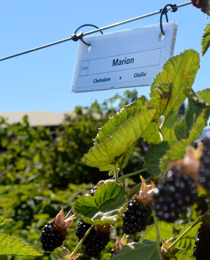 Marion blackberries, or marionberries are a cultivated variety of blackberry originally developed right in our backyard by the USDA at Oregon State University in Corvallis. A cross between the ‘Chehalem’ and ‘Olallie’ blackberries, both of which have Loganberry parentage, these cane fruits have been called “the berry by which all others are measured.”